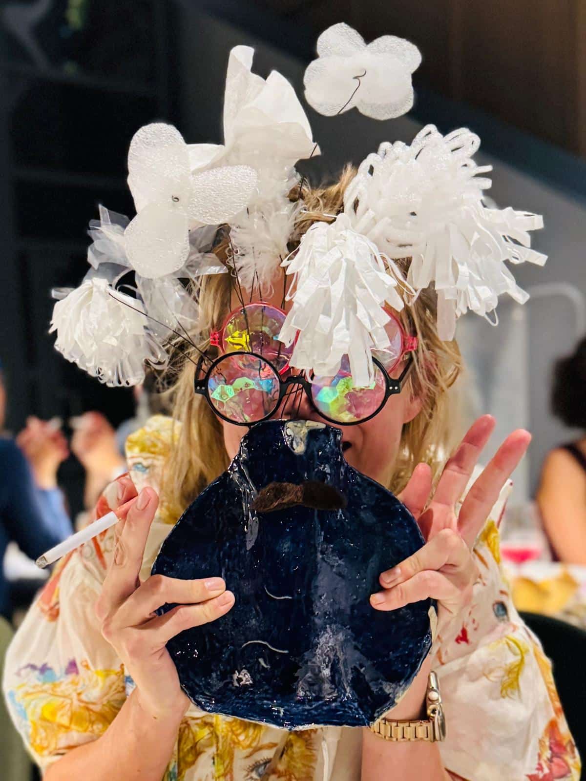 Working from Beaumont Studios and her home ceramic garage, her work sits at the border between her inner and outer worlds. Extending beyond the canvas, she creates installations and, more recently, collaborates to develop interactive ceramic tools for shared dining experiences—elbow crayons, porcelain flower petals, and swans spilling dressing on their salad feathers—exploring how to engage others in the manifestation of imagination.